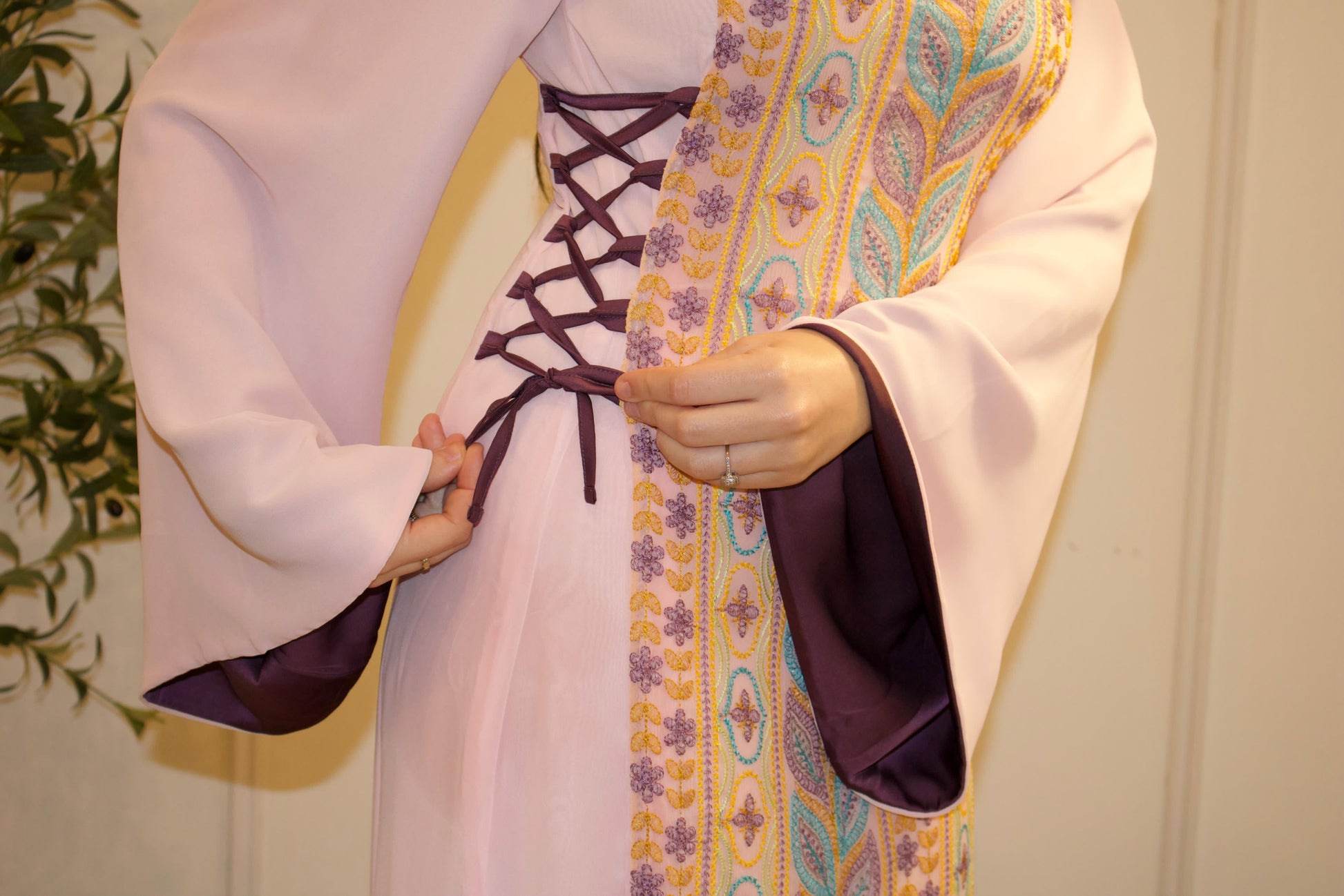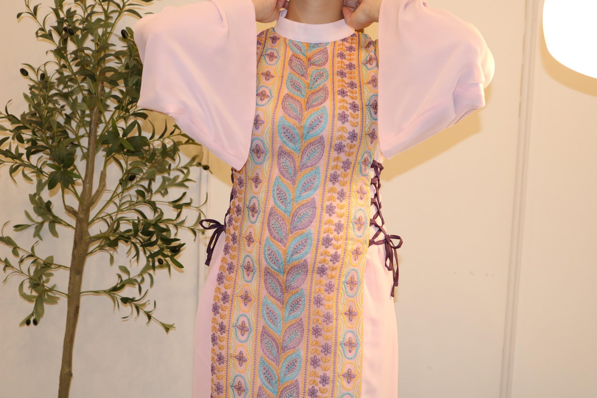 The Naqsha dress is a refined blend of tradition and contemporary elegance. Inspired by ancient Tiraz embroidery, this piece features a central panel of intricate motifs in soft pastel tones, framed by a flattering silhouette that drapes with grace.
